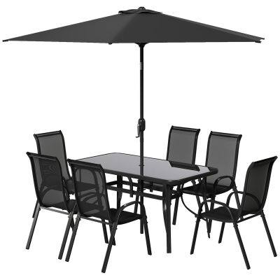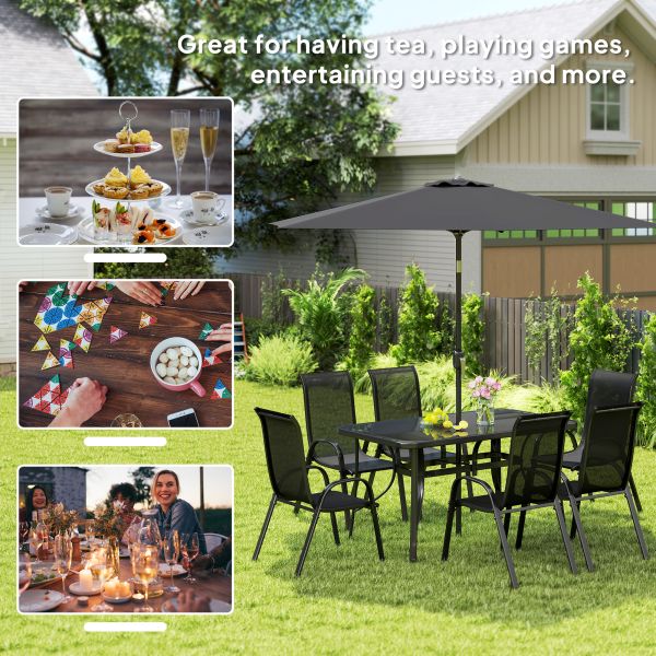 Maybe you have a big family, or you want to host parties; something is for sure, outdoor dining needs a place to sit. [BRAND NAME] has you covered. [BRAND NAME] has a patio dining set for six chairs, an outdoor table, and a big sunshade umbrella. Sit down to dinner, share drinks, or play a board game. You won't have to worry about sunburns, and the chairs are breathable so that you can sit out extra long. Afterward, the table offers a wipe-clean surface. Get out, get comfy, get [BRAND NAME].
