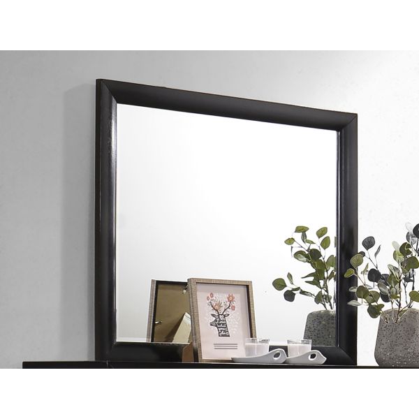 Expand the sense of space in your bedroom with this elegantly framed mirror. Designed in a sleek black finish, it features clean lines and subtle beveled edges that bring refined depth and dimension to any wall or dresser surface. The rectangular frame pairs beautifully with matching furniture pieces, offering a cohesive look across the room. Crafted from durable rubberwood and okume veneer, this transitional mirror combines strength, simplicity, and timeless design for lasting everyday use.