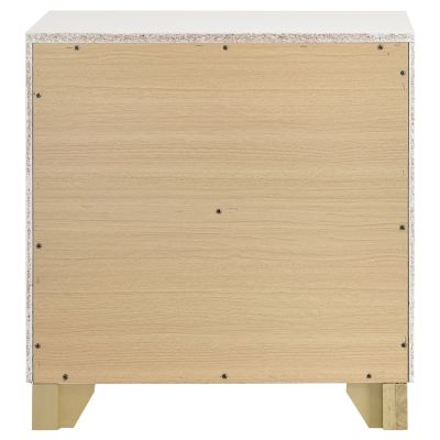 Put the finishing touches on a chic bedroom with a modern two-drawer nightstand. In white with metallic gold embellishments, it's the perfect solution for nighttime storage. Drawer fronts feature rounded corners for a softened look and feel. Use the top for a reading lamp or personal decor that brings inviting ambiance. Drawers hold up to 44 pounds each, perfect for everything from personal items to books and other accessories.