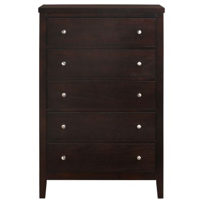 Organize your space with this five-drawer chest, offering clean lines and timeless appeal. The rich cappuccino finish enhances the warmth of its wood construction, while brushed silver hardware adds a subtle modern touch. Five spacious drawers provide ample room for folded clothing, accessories, and essentials. Built from rubberwood, veneer, and engineered wood for strength, this chest pairs lasting durability with classic elegance, creating a versatile addition to any bedroom layout.