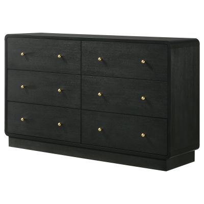 Complement a stylish bedroom with the abundant storage featured in a modern six-drawer dresser. Delivering a sophisticated presentation, it boasts a black finish over melamine surfaces that resist damage to remain looking their best. Ball knobs complement each drawer front, standing out with a rich, warm brass finish. The case of the dresser features rounded corners, softening the overall presentation of the dresser. A wide top is ideal for jewelry boxes and decor that lends a personalized touch.