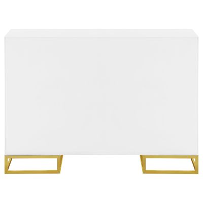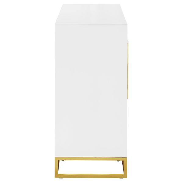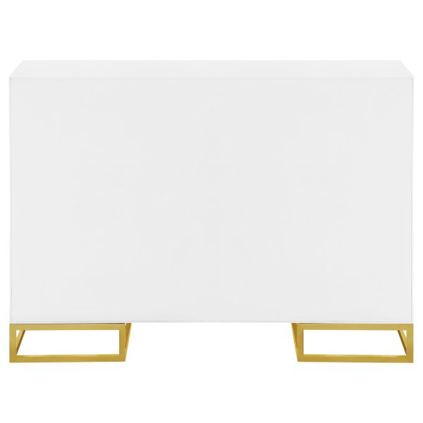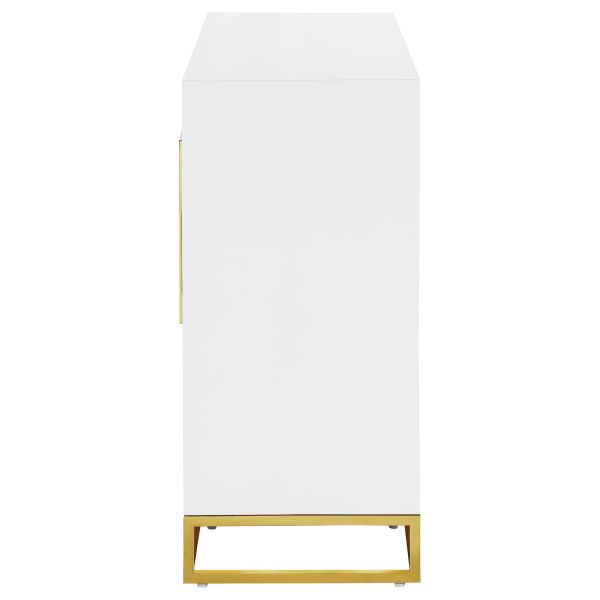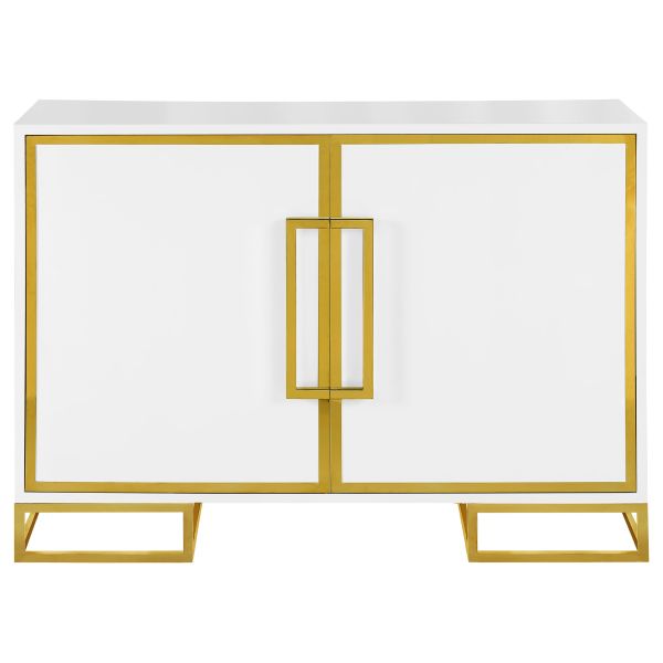 Add a bold statement piece to your space with this stunning modern accent cabinet. Featuring a glossy white finish with lustrous gold stainless steel trim, it showcases Art Deco flair with clean lines and geometric base supports. Behind double doors, adjustable shelves offer customizable storage. Crafted from durable MDF and stainless steel, this cabinet blends glamour and function beautifully in any setting.