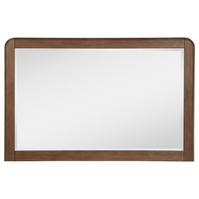 Upgrade your dresser with a matching framed mirror. It's a handsome presentation that features rounded open corners on a walnut veneer frame with subtle grain details that add approachable style. The mirror is a horizontal presentation, adding airy lightness and reflectivity to your bedroom. The mirror includes beveled glass that offers both dimension and an elevated look. The mirror mounts directly to your dresser and is perfect for morning and evening grooming.