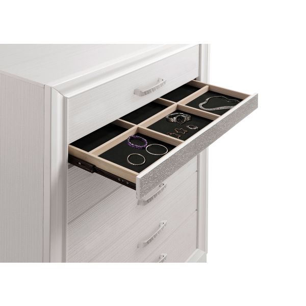 Add posh, upscale ambiance to your bedroom decor. This chic, stylish chest livens up a room with a dazzling touch of sparkle. With a hidden jewelry drawer built in, it keeps valuable items safe and secure. Its drawers are lined with felt for a luxurious hint of softness. Its six convenient drawers are built with metal extension glides for versatile ease of use.