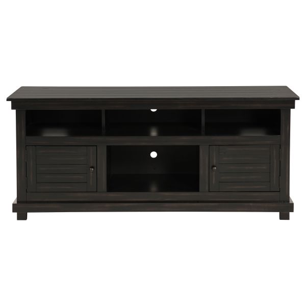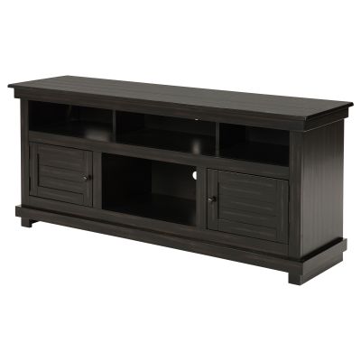Complete a media center in your inviting home with a modern farmhouse TV stand. It's an approachable design with roughhewn wood details that create texture and dimensionality in your living space. Two shelves and six compartments create ample storage, perfect for everything from peripherals and accessories to personal decor. The media console features a clean-lined silhouette with a slim profile, perfect for a flat panel or wall-mounted television. This TV stand accommodates televisions up to 65 inches.