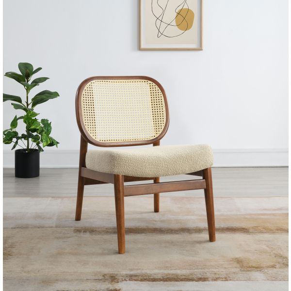 This accent chairs introduces a warm, airy presence to any living area. Lounge chair features a rattan open cane webbing back that breathes natural style and a fabric upholstered cushioned seat for soft, supportive comfort. The solid hardwood frame provides timeless stability. Ideal as occasional chair for reading nooks or side chair in conversation areas, this piece blend casual elegance with functional seating.