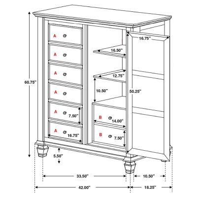 Add refined storage to your bedroom with this versatile door chest, offering both drawers and shelving to organize your essentials. With six spacious drawers and a cabinet door that opens to reveal an additional two drawers with shelving, this chest provides the perfect combination of concealed and open storage. The felt-lined top drawer is ideal for protecting delicate items, while the brushed nickel hardware adds a touch of modern elegance. Built from solid hardwood and engineered wood, this chest is finished in a neutral color, making it both durable and timeless in design. Whether you need extra space for clothing, linens, or other bedroom items, this door chest blends practicality with classic charm.
